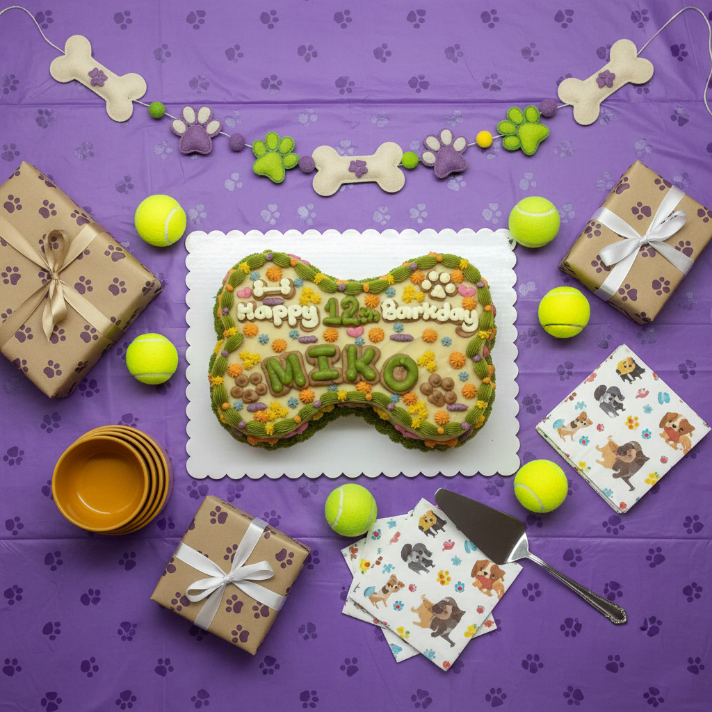 Have BIG barkday bash for the entire Bark-ADA! Our Extra extra Big Celebration Bone cake is really a show stopper, it weighs more than 3 kilos! You may want to cut up the pieces prior to serving it to your pup and guests because a lot of dogs get pretty intimidated with the size and shape. Each cake can have a personal message. Even our colors are all natural juices from different food ingredients! Colors and looks of cakes may vary depending on your choice of frosting and the extra decorations made and the produce available.