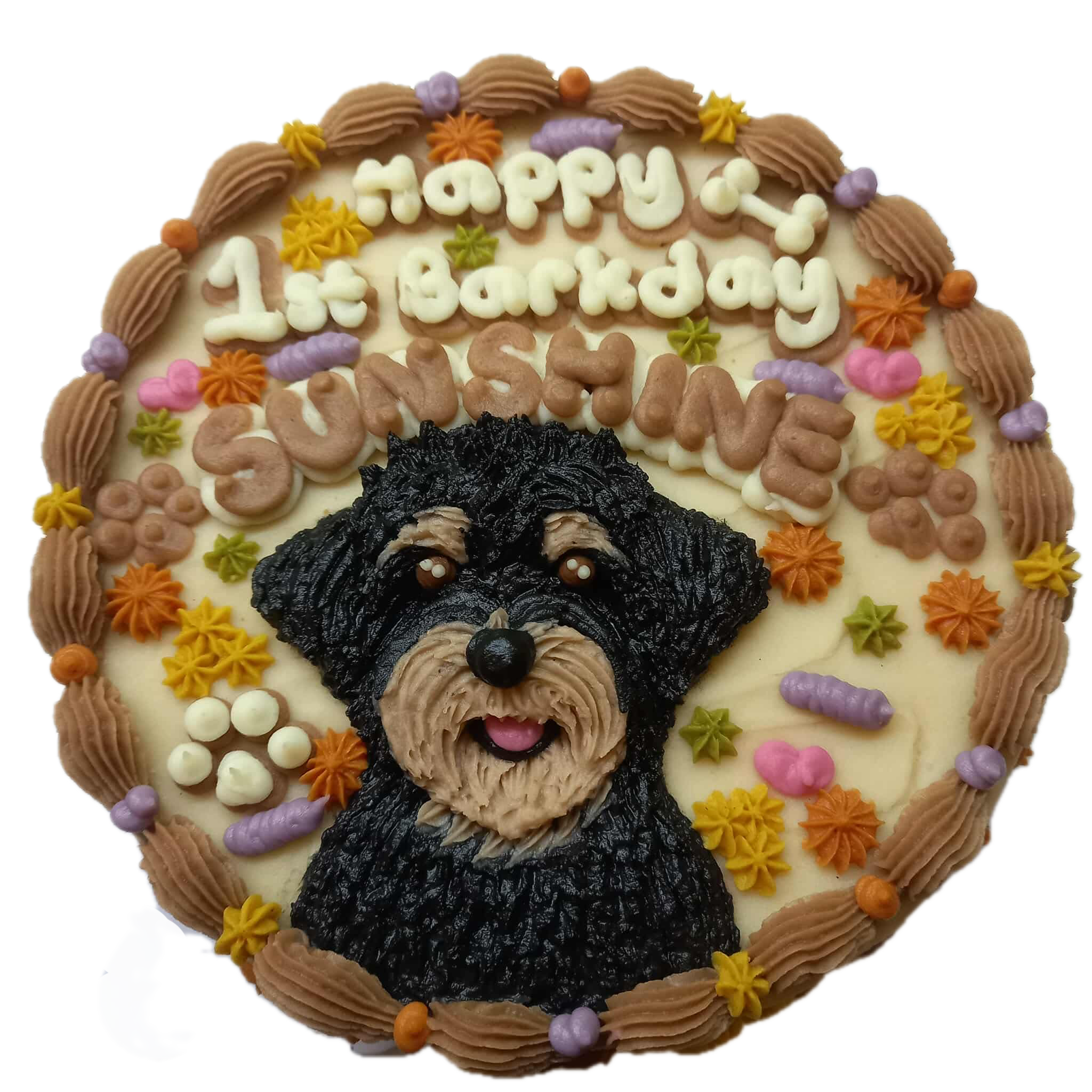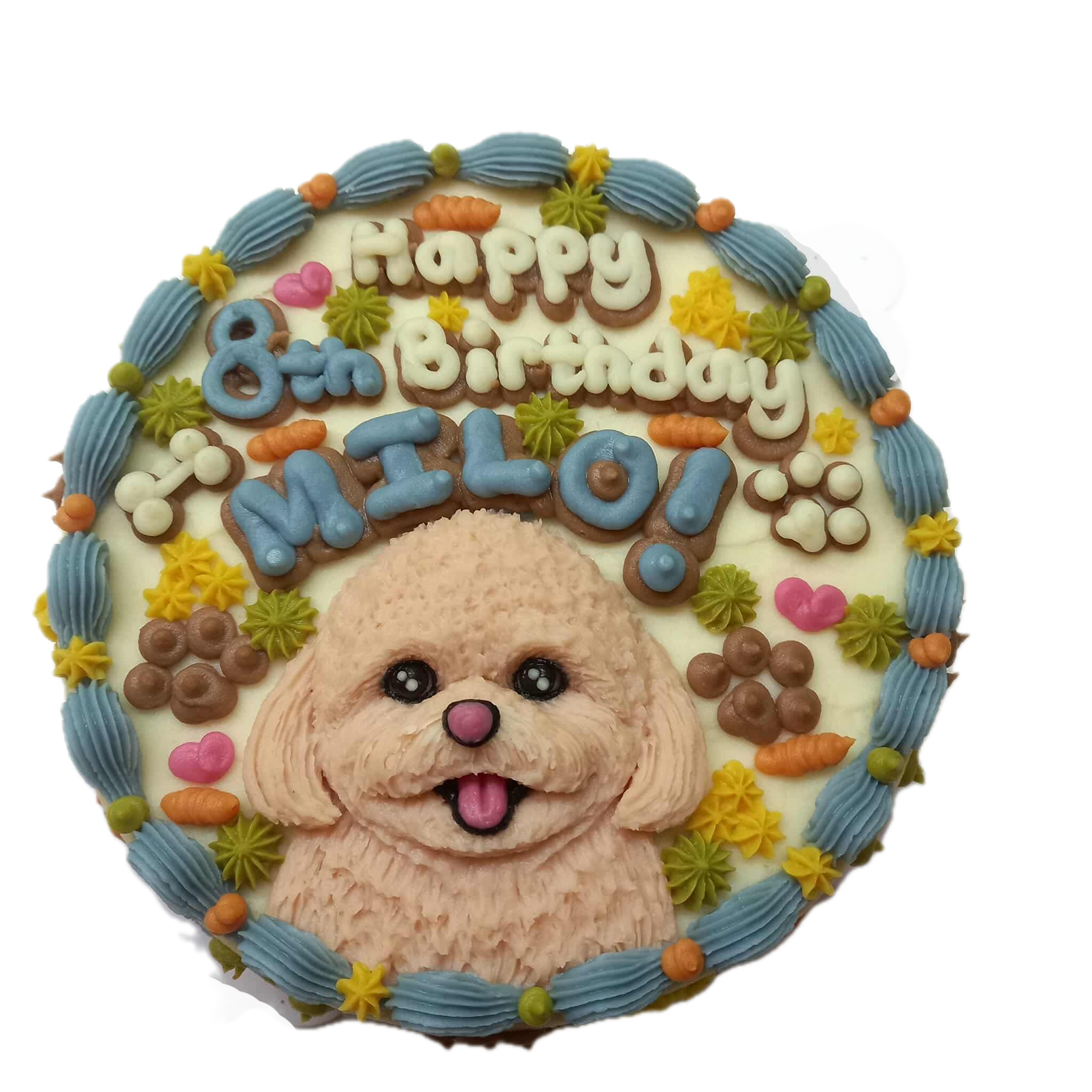 You may want to cut up the pieces prior to serving it to your pup and guests because a lot of pups get pretty intimidated with the size and shape. Each cake can have a small personal message such as “Happy Birthday Pup!” or a 3 word message you would like. Colors and looks of cakes may vary depending on your choice of frosting and the extra decorations made.