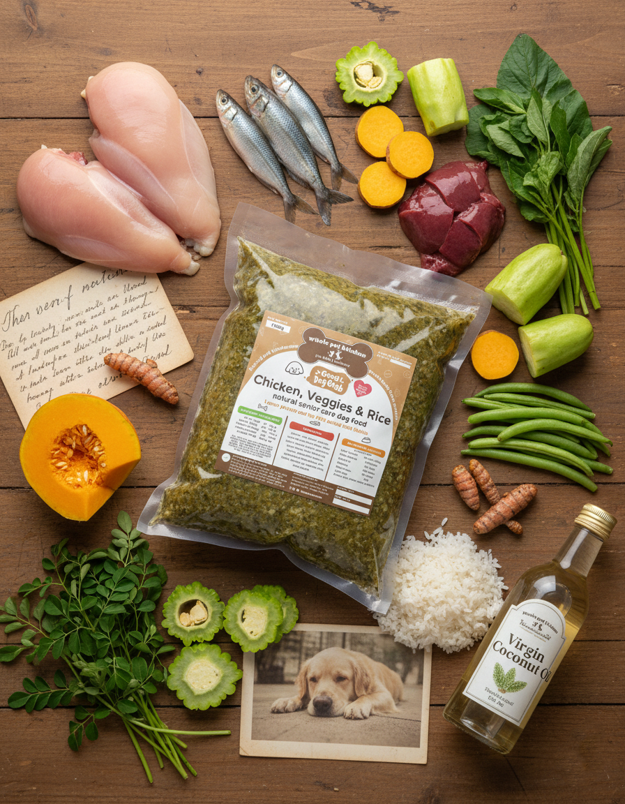 chicken, rice, squash, chayote, water spinach, sweet potato, bitter gourd, moringa oleifera, sardinella, green beans, virgin coconut oil, taurine, fish oil, turmeric, eggshell calcium, vitamins and minerals, milk thistle, flaxseed oil, icelandic kelp, black pepper